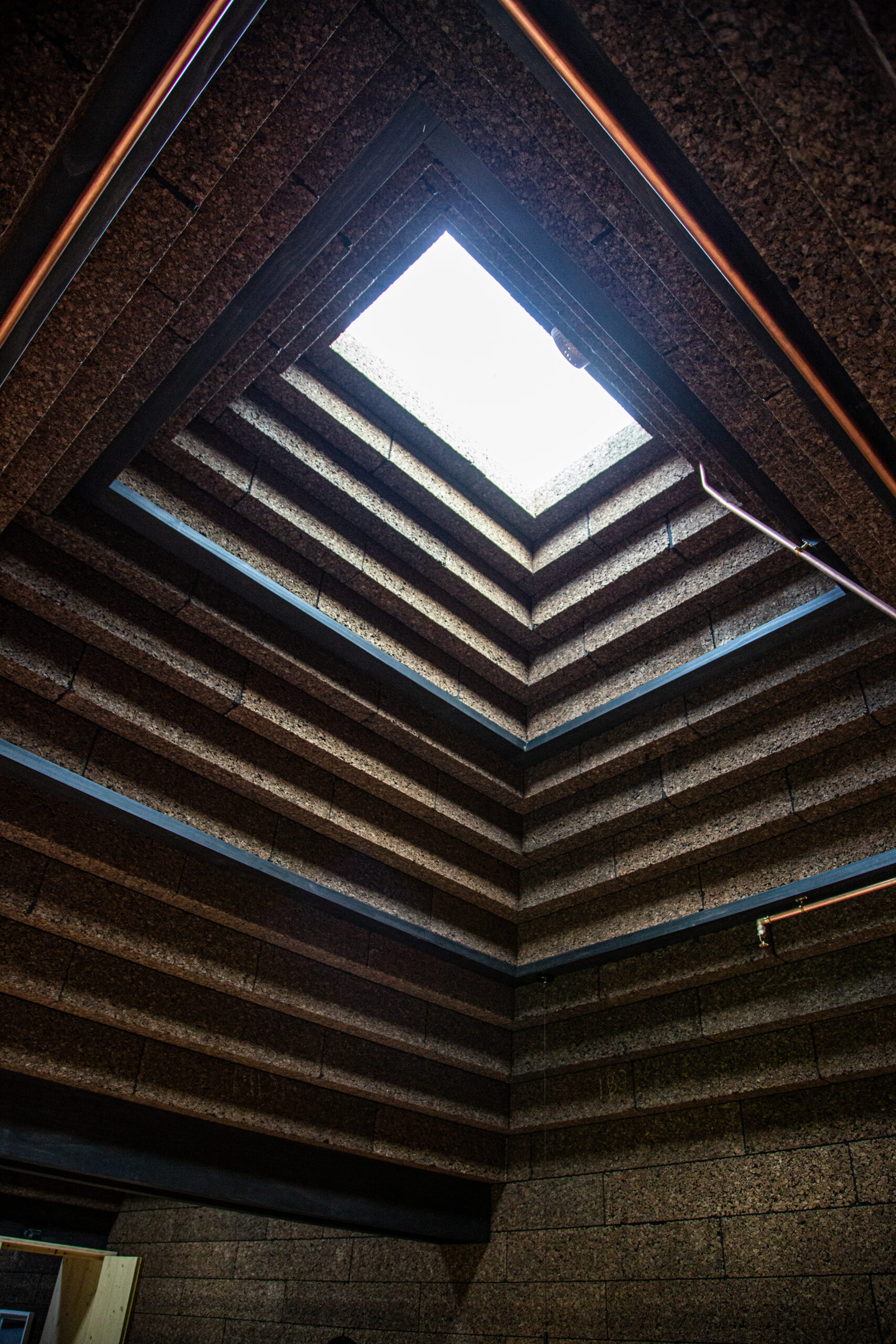 A challenge of building with cork is its tendency to absorb both light and sound. By placing rooflights strategically, the interior is flooded with light from above, bouncing off the floorboards and reflecting back into the space. The toplighting throws the three-dimensional form of the cork into strong relief, creating a sequence of dramatic light and dark steps.
