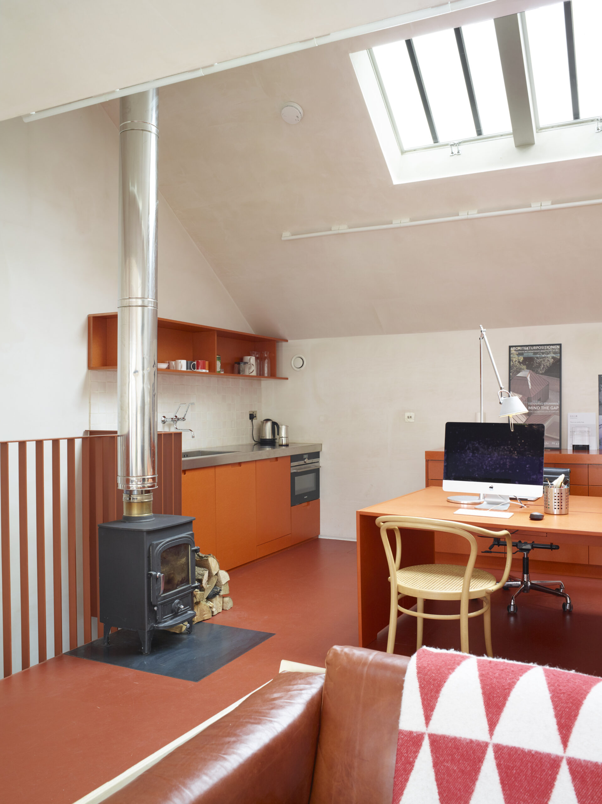 Internally, the building reveals a surprising transformation. Entering through the side of the archway and up the stairs, visitors are met with a warm, bright and romantic space. The charming studio is adorned with natural light, creating an ideal environment for focus and creativity. The authentic manual winders, accessed with an extension handle, enhance the tactile experience of operating the rooflights while providing essential ventilation.