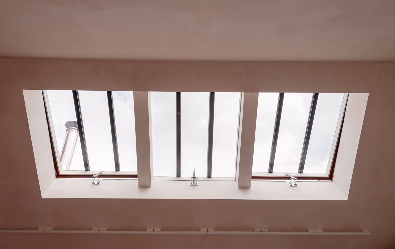 The stunning double row of The Original Conservation Rooflights linked side by side, allowing the joining structural supports between the casements to be kept to a minimum. Externally, the signature features of The Conservation Rooflight from The Rooflight Co. complement the Victorian façades along the residential street. Internally, the charming and intimate space is adorned with natural light. The authentic manual winders, accessed with an extension handle, add to the experience of interacting with the rooflights and the studio space, providing essential ventilation to the studio for its inhabitants.