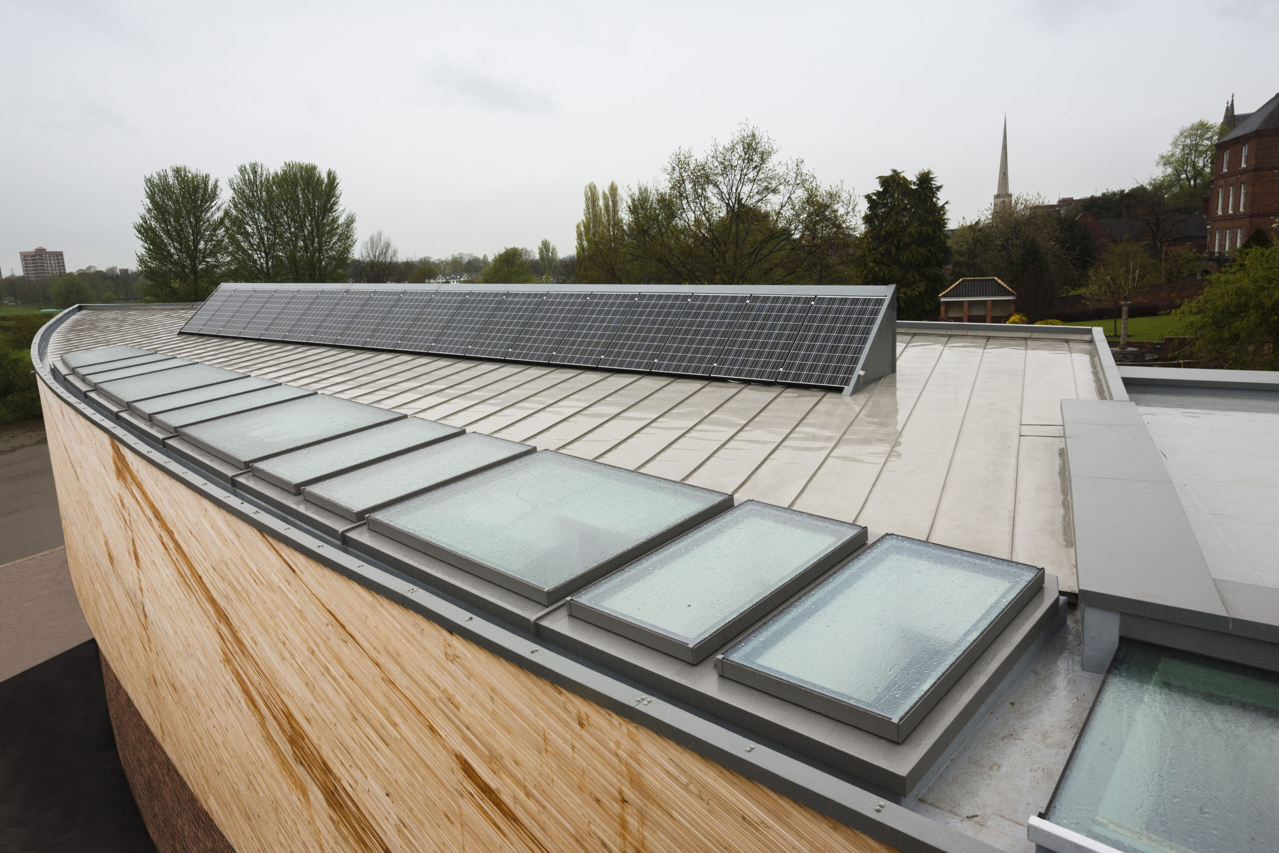 The Michael Baker Boathouse is an award-winning contemporary boathouse for King’s School, Worcester imagined and designed by Associated Architects. Situated in the heart of medieval Worcester with an academic history dating back to the 7th century, the boathouse is a striking, modern design that echoes the shape of a boat and features a cantilevered prow that points towards the River Severn. The unusual sweeping curve of the building required a bespoke rooflight solution that fitted seamlessly into the unique structure.