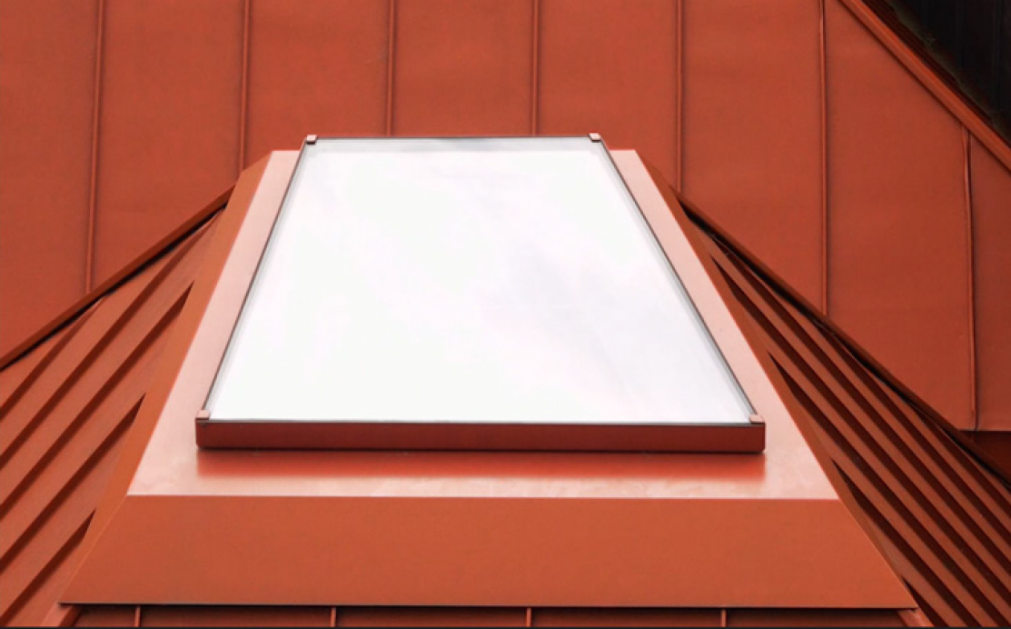 Externally, the rooflight frames were colour-matched to RAL 8004 (Brick Red) to complement the standing seam metal cladding, appearing as intentional ‘slices of red steel’ topping each pyramid. Internally, the frameless design of the Neo Rooflights maximises the viewable opening, making it appear as though the roof is open to the sky.